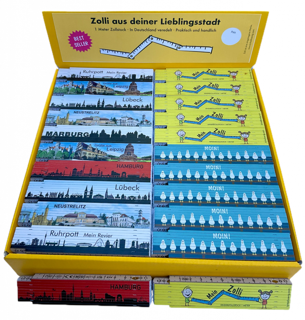 Ob beliebte Städte-Editionen, fröhliche Kinderzollstöcke oder kreative Spruch-Designs – du entscheidest, welche Motive ins Display kommen. So kannst du es perfekt auf deine Kundschaft und dein Sortiment abstimmen.